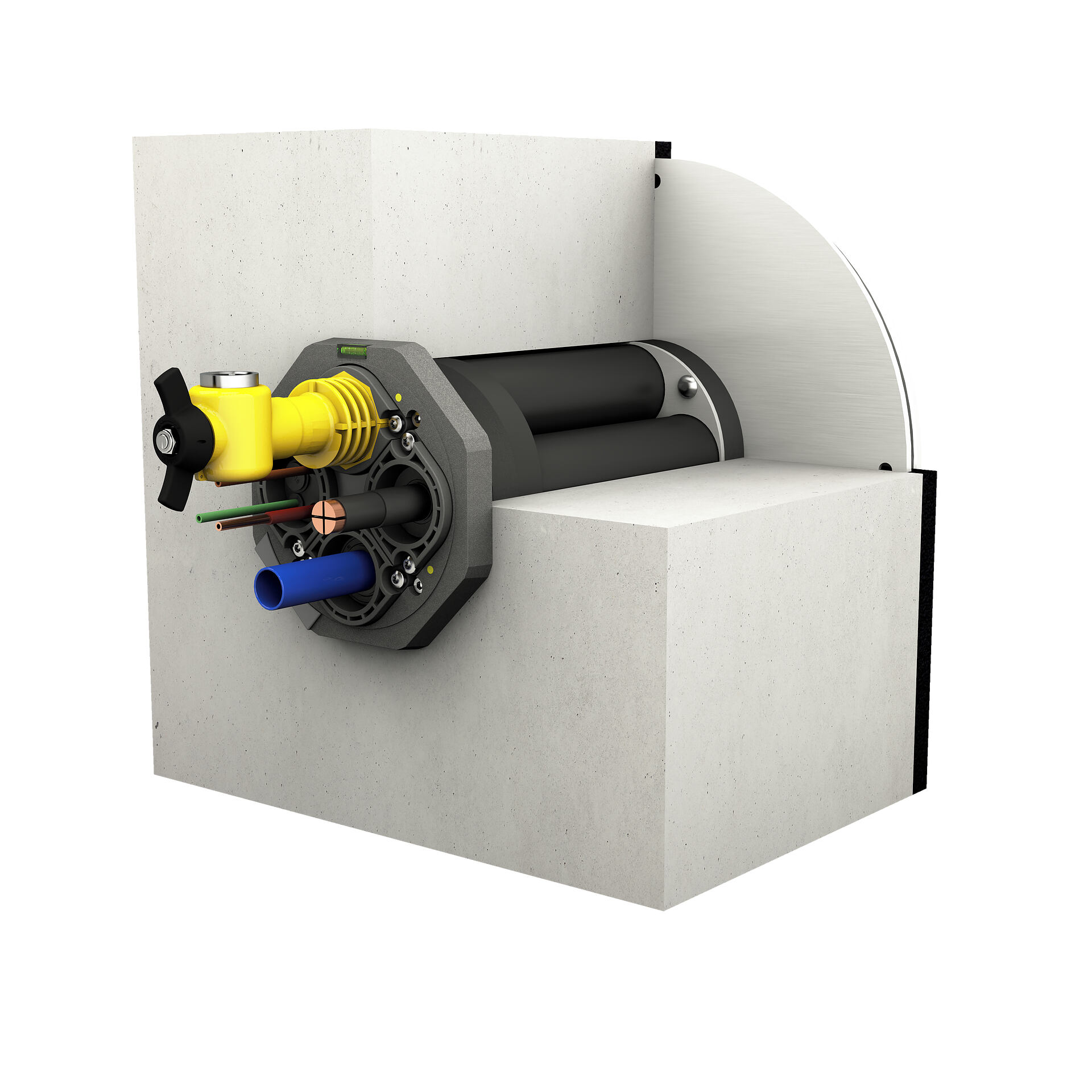 Fest-/Losflansch für Mehrspartenhauseinführungen - GV 1 bei unterkellerten Gebäuden mit Dichtbahnen nach DIN 18533 W2.2-E. Geeignet zur Aufnahme von Dichtbahnen aus Bitumen oder Folie (bei Folie Zulagen erforderlich, siehe Zubehör).