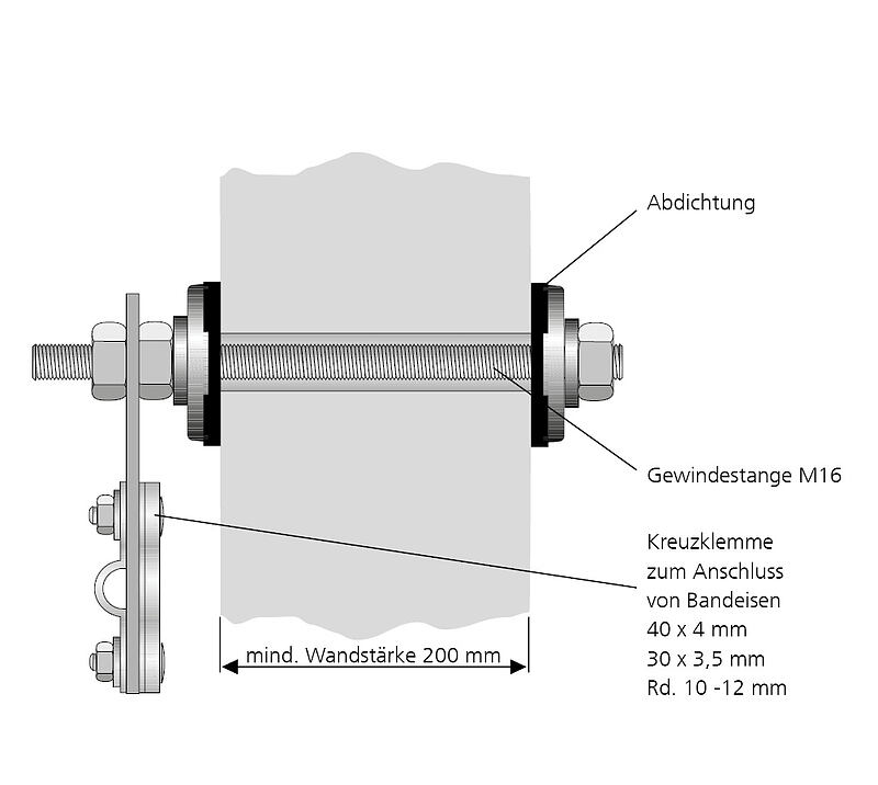 Für den nachträglichen Einbau in bestehende Wände mit Perimeterdämmung. Die Abdichtung zur Wand erfolgt beidseitig über eine Flächendichtung, die mit Muttern zur Wand verpresst wird. Über eine Anschlusslasche mit Kreuzklemme können Flach- bzw. Rundstähle angeschlossen werden.