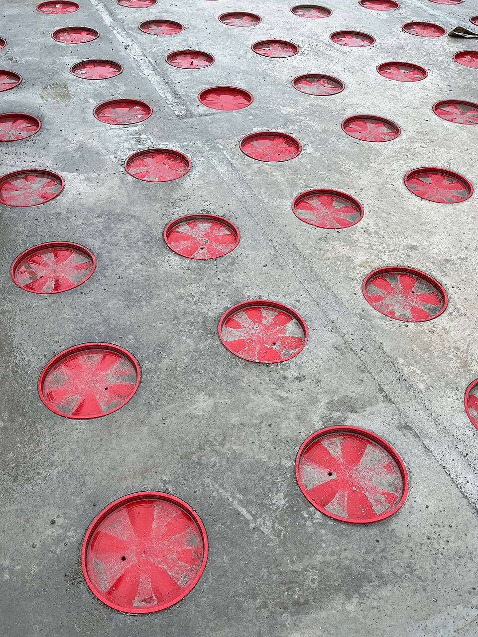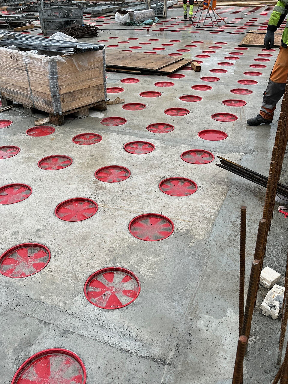 Einzelnes Fertigbetonfeld eines Waffeltisches auf der Lüftungsebene im Rohbau mit integrierten und verschlossenen Zement-Verbund-Rohren.