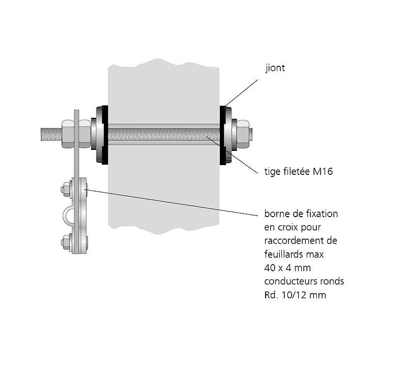L'étanchement par rapport au mur s'effectue des deux côtés par le biais d'une étanchéité superficielle pressée par des écrous contre le mur. Il est possible de raccorder des aciers ronds et plats par le biais d'une éclisse de raccordement avec borne de fixation en croix.