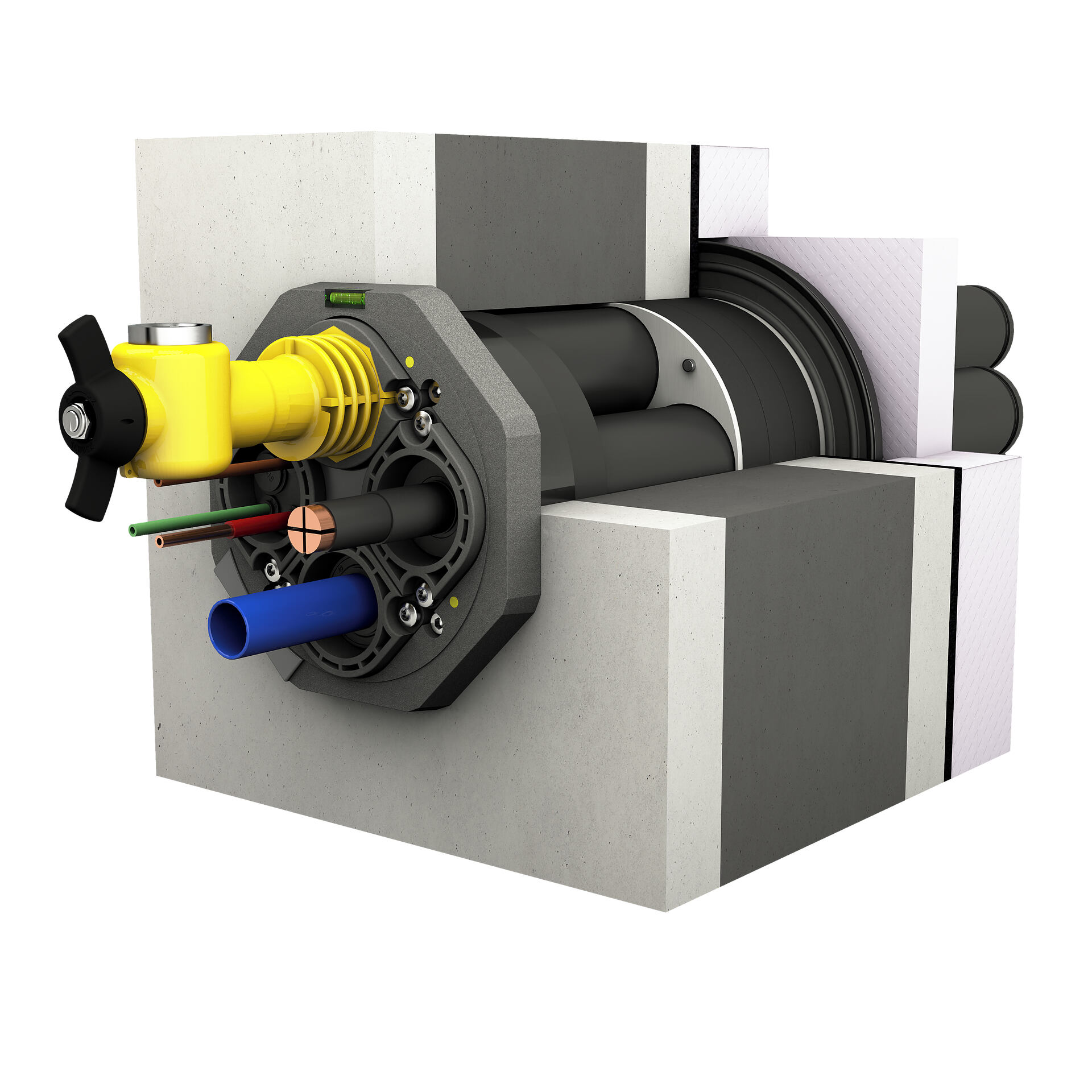 Elemento di tenuta esterno combinato per l'integrazione dell'entrata multilinea per edifici PolySafe in fori di carotaggio nelle pareti stratificate/doppie, per il collegamento di guarnizioni già presenti in edifici. Grazie alla larghezza di tenuta di 90 mm, questo modulo sigilla sia la cassaforma per la gettata di calcestruzzo della parete stratificata/doppia, sia il calcestruzzo gettato in opera.